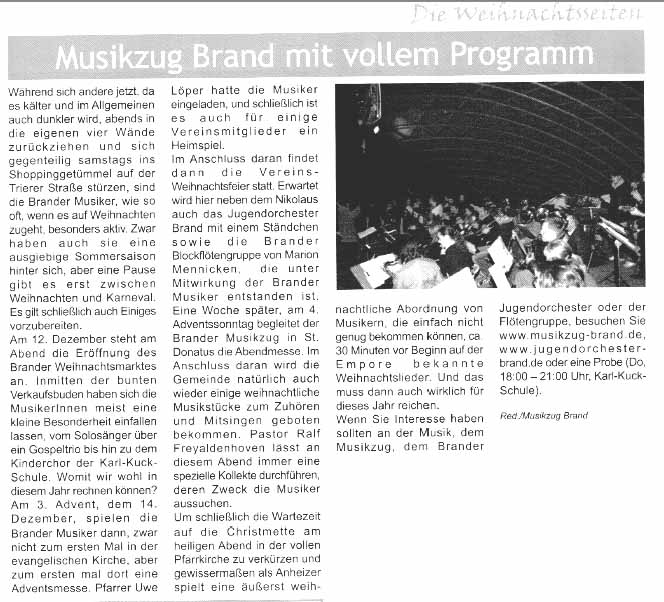 Musikzug mit vollem Programm im Dez. 08 ... wenn sie Interesse haben sollten an der Musik, ... dem Jugendorchester, Blockflötengruppe oder Marschtrommelgruppe ... besuchen sie uns! Weihnachten in Brand mit der musikalischen Unterstützung des Musikzuges Brand zu Gunsten eines guten Zweckes... (Veranstaltungen)